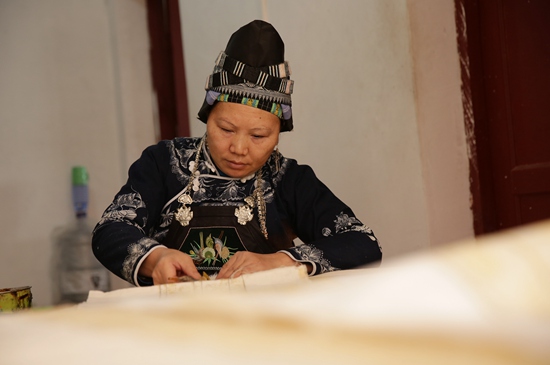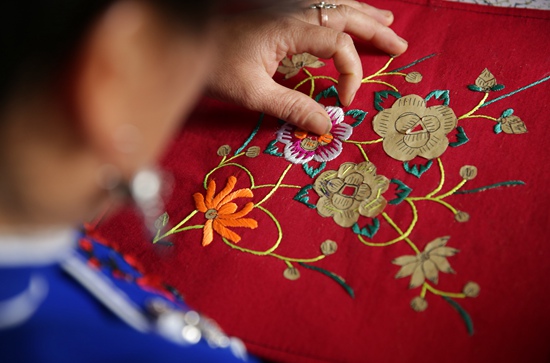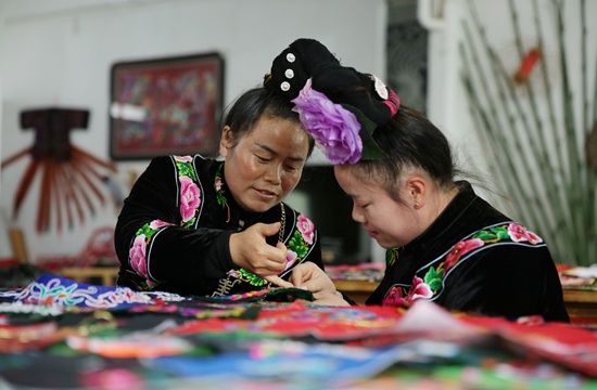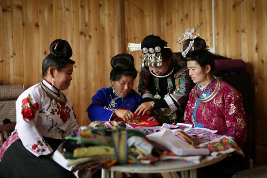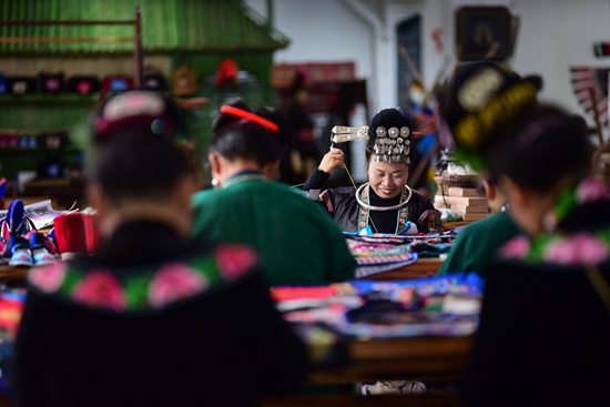 近年来,贵州省黔东南苗族侗族自治州丹寨县积极鼓励农村妇女利用手工技艺居家创收,成立非遗手工合作社,承接旅游产品订单,把传统的手工艺品变成脱贫增收的旅游商品销售,使当地农村妇女走出一条“指尖经济”的脱贫增收之路。图为村民们在刺绣。黄晓海/摄(新华社发)