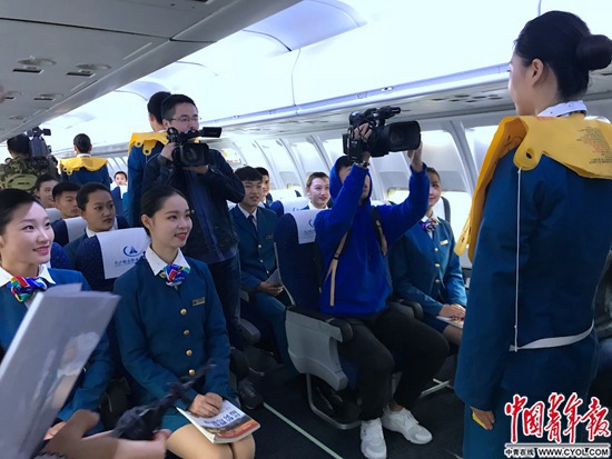 11月6日,教育部奋进之笔“1+1”走进湖南媒体采访团到访长沙航空职业技术学院,该学院空乘专业大二学生正在校内的波音737—200客舱中实训。中国青年报·中青在线见习记者 孙庆玲/摄