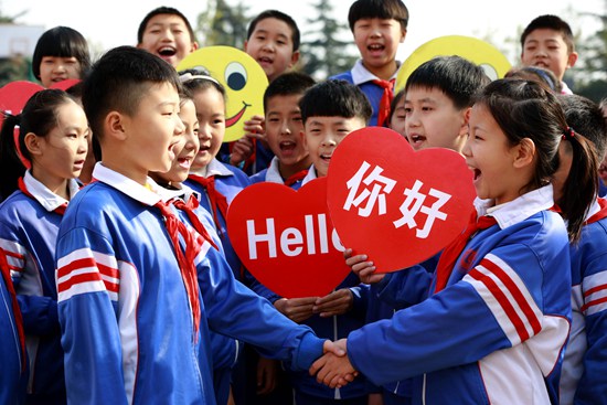 11月20日,河北省武安市中山小学的学生在互相问好。当日,各地学校纷纷组织开展“世界问候日”主题活动,迎接11月21日“世界问候日”的到来。胡高雷/摄(新华社发)
