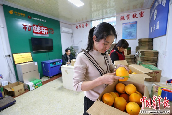 11月16日,江西省赣州市会昌县,小密乡半迳村电商服务站点,站点负责人为果农销售赣南脐橙。据介绍,会昌县开展电商扶贫以来,截至今年9月底,全县建立了381个乡村服务站,注册电商企业470家,累计带动贫困户1335人从事电商就业创业。中国青年报·中青在线记者 李建泉/摄