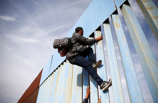 当地时间11月19日,一名中美洲移民在美墨边境徒手攀爬隔离墙。大批中美洲移民仍在美墨边境逗留,寻找进入美国的机会。视觉中国供图