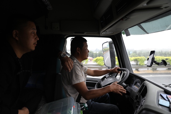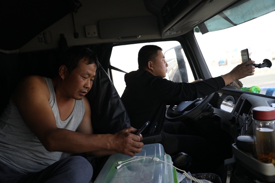11月7日上午11点,进入乌鲁木齐境内后遇上堵车,孔令玉(右)用手机上的地图App查看前方路况。此时他们行驶已经65小时,但将堵车情况上报公司,可以免于被罚款。