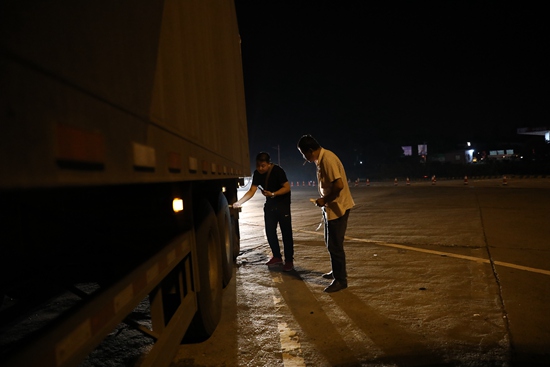 11月4日下午6点,湖南省衡东县雁城服务区,他俩用锤子敲打每个轮胎,检查车况。