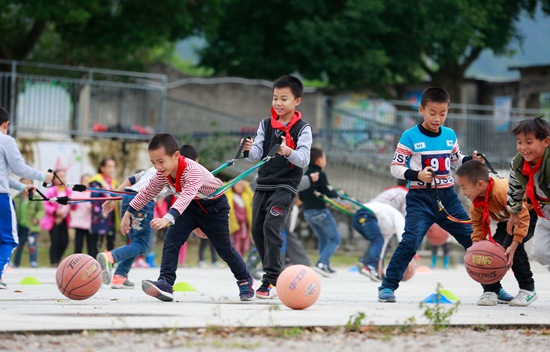 11月21日,在广西柳城县冲脉镇大要村小学,孩子们在玩运球游戏。连日来,广西柳州市柳城县冲脉镇举办青少年篮球培训班。由柳州市青年篮球教练组成的志愿者服务小分队走进贫困山村,手把手指导孩子们学习篮球运动基本技能,让孩子们感受运动的快乐,增强他们参与体育运动的积极性。邓克轶/摄(新华社发)