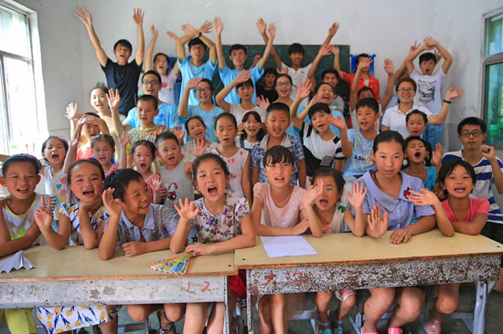 河南南召大沟村小学,学生们跟支教志愿者在一起。