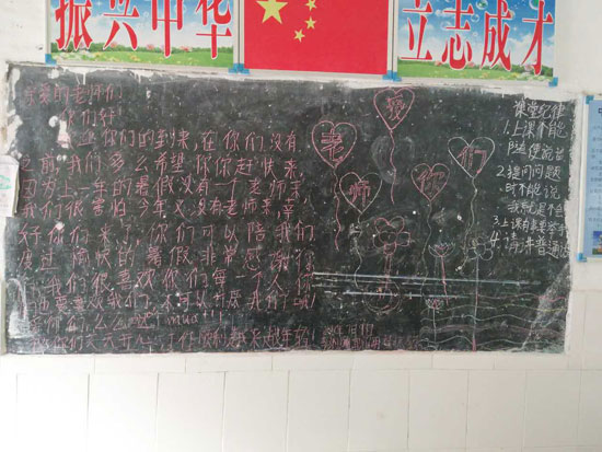 一年后,2017年暑假,志愿者如约而至时,刚下车,就看到孩子们齐刷刷地站在校园里等着迎接我们,而黑板上写的正是上面的这封信。