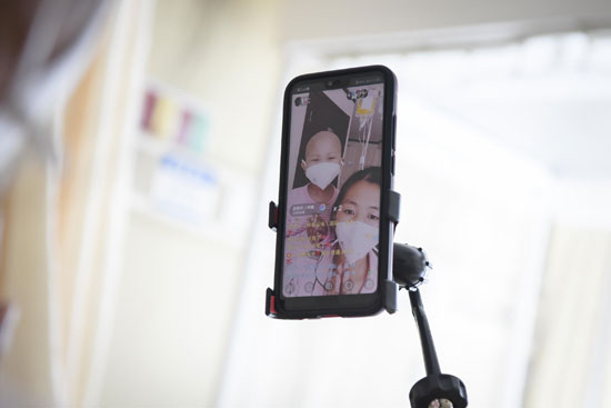11月12日,北京一家医院,董玉梅和患白血病的女儿欣宜在病房里直播。孩子生病后,直播间的朋友一直为她们提供帮助,陪伴她们,其中有白血病人、志愿者,更多的是来自五湖四海的网友。视觉中国供图