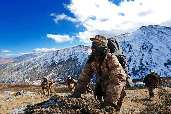 11月,翁春芳带领官兵巡线至白马雪山,在缺氧环境中负重艰难前行。雎心阳/摄