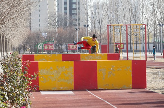 八一军事五项队男子组一名运动员侧身飞跃断墙。王爽/摄