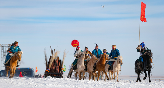 12月23日,乌兰牧骑成员在开幕式上表演。当日,第十六届内蒙古冰雪那达慕在呼伦贝尔市开幕。新华社记者 虞东升/摄