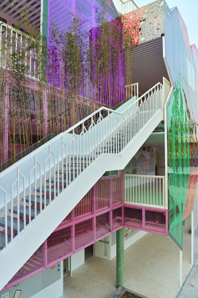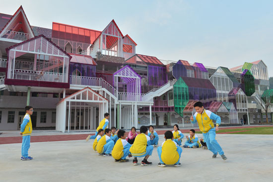 浙江省千岛湖畔的大山里,有一座“梦幻城堡”式的学校:彩色透明材料做外墙和楼梯,不同区域错落有致,当阳光照射时,楼道里色彩斑斓;教室也都是功能型的,分为讨论区和休息区、活动区;每个楼梯旁边是一个小滑梯,孩子下楼可以直接滑下来……