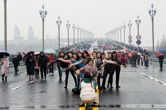 12月26日,游客在南京长江大桥拍照留念。当日,经过全封闭维修改造后的南京长江大桥公路桥向公众开放,吸引不少游客前往。新华社记者 李博/摄