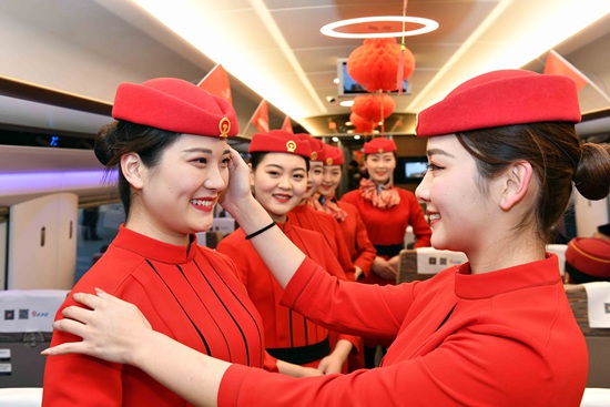 12月26日,济青高铁G9217次列车乘务人员在整理仪容。当日,济南至青岛高速铁路(济青高铁)开通运营,济南至青岛最快列车运行时间由原来的2小时20分,压缩至1小时40分。