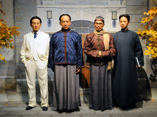 2016年7月“中国现代文化名人蜡像艺术展”在中国国家博物馆展出,该图为梁启超、王国维、陈寅恪、赵元任,著名的清华国学院“四大导师”。视觉中国供图