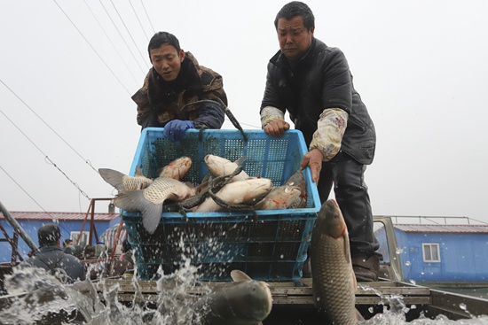 1月6日,江苏省淮安市洪泽区岔河镇养殖户在捕鱼。 当日是农历腊月初一,江苏省淮安市洪泽区进入捕鱼高峰期,该区岔河镇的养殖户们顶着严寒进行捕捞,一派繁忙的景象。万震/摄(新华社发)