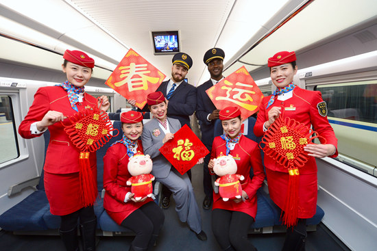 1月20日,在西安北站动车组列车上,列车工作人员与西安交通大学3名外国留学生志愿者合影,迎接2019年春运。当日,志愿者在中铁西安客运段工作人员指导下,熟悉动车组服务设施。唐振江/摄(新华社发)