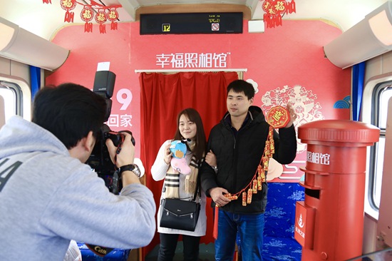 在杭州开往兰州的T112次列车12号餐车上,热闹喜庆的“幸福照相馆”的背景墙吸引着不少旅客的眼球,工作人员免费为来往的旅客拍摄照片。王椰萍 中国青年报·中青在线记者 董碧水/文 张丽广/摄