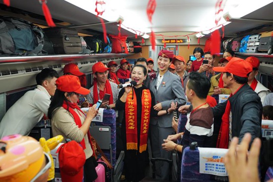 云南600多名务工人员免费坐动车回家过年,图为动车上大家为53岁的杨荣珍庆祝生日。杨航/摄