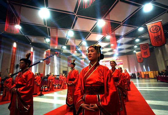 安徽省庐江县首届“新年新人新风·有爱有你有家”古典汉式青年集体婚礼日前在千年古镇汤池举行,来自该县的19对新人着华夏之冠,行汉唐之礼,在亲友和400多名观众的见证和祝福中,经过对席、沃盥、同食、合卺、结发、敬亲、执手、撒喜等仪式喜结良缘。活动旨在倡导文明新风,弘扬传统文化,推进移风易俗。
