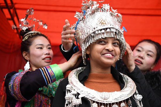 1月29日,长沙理工大学的埃塞俄比亚留学生高丽(中)在庙会上佩戴苗族银饰。春节临近,湖南长沙多所高校的留学生来到长沙市黄兴路步行街,表演舞龙、逛庙会,感受中国传统节日文化。新华社记者 薛宇舸/摄