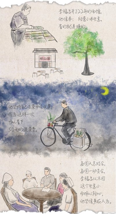 改革开放头些年,做生意还被人瞧不起。上个世纪90年代,李福昌在工厂兼职开饭馆,主顾大多是工人,有天工厂突然下午放假,工人回家吃饭,午餐可能白做了。于是他端着面条跑到工厂门口,逆着人流叫卖,尽可能拦住熟人。有人嘲笑他,也有人拿出了饭盒。那锅面最终卖完了。