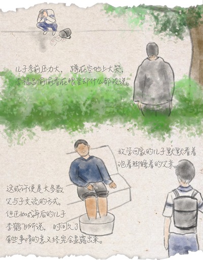 李福昌的视角更能呈现一位父亲的细腻:李鹤飞中考前压力很大,跑到空地上嚎啕大哭,李福昌其实躲在旁边的树林里偷看,但什么都不说;高中去开家长会,儿子在校门口提前等他,还备了纸和笔。这令李福昌高兴许久,觉得孩子变了,“可以放心了”。后来李鹤飞有次烦躁,说“不想在这个家待着”,他在日记里偷偷“震惊”,长久地反思,是否给的压力太大……