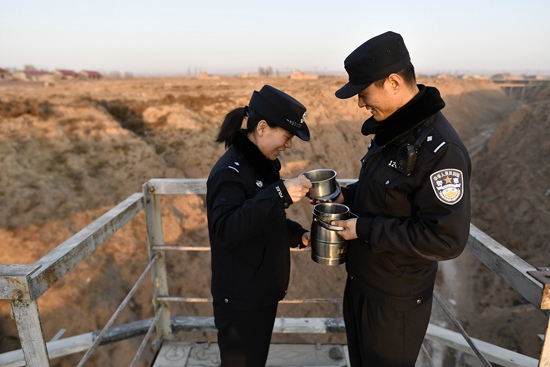 苟发伟与妻子罗亚坤在宝中线381公里八里沟铁路桥会面(1月23日摄)。在宝中铁路的一段36公里长的铁路线上,铁路民警苟发伟、罗亚坤夫妇分别值守在海原县李旺车站派出所和同心县同心车站派出所。夫妻俩难得相见,只有在巡线时分别跨越24公里和12公里,才能在两个派出所辖区交界的地方“相会”。新华社记者 王鹏/摄