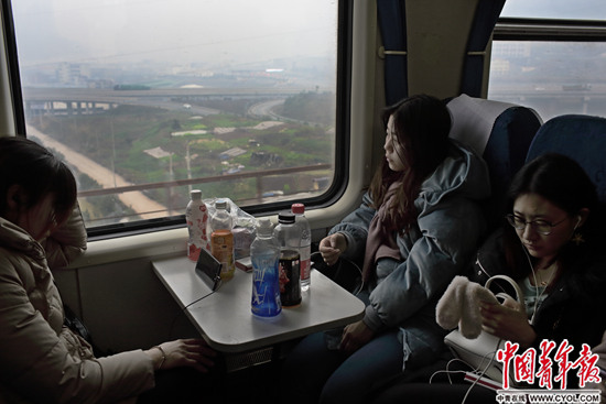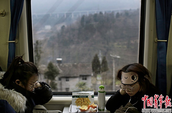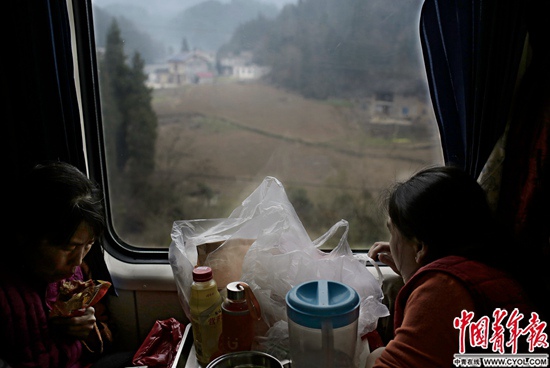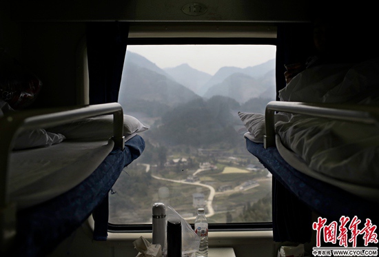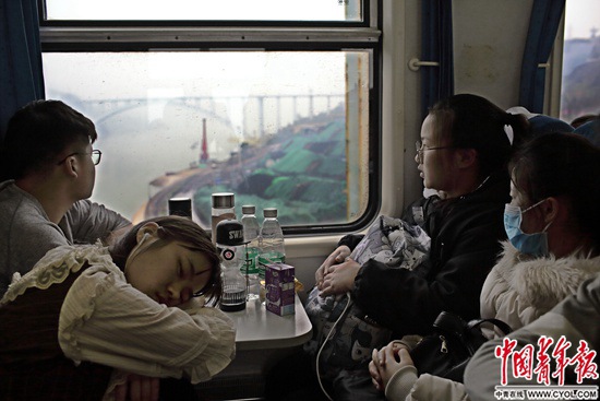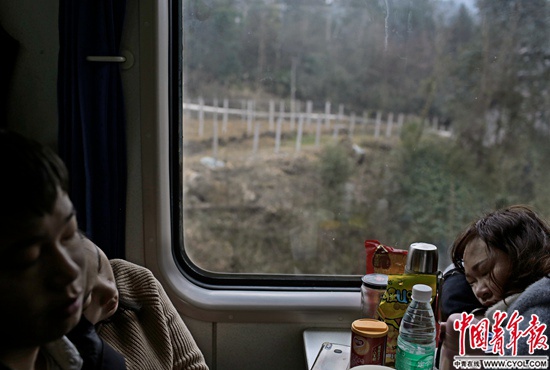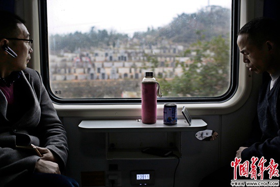 1月24日中午,在我国修建难度最大的宜万铁路,由杭州开往成都东的K529次列车穿越三峡库区,驶出武陵山区,即将进入川渝。硬座车厢里,几位返乡的年轻人安坐在窗前。