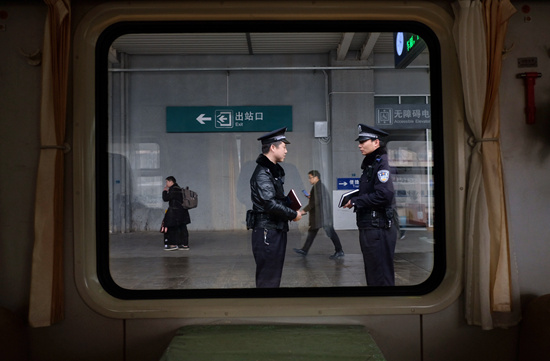 恩施站,K529次列车乘警余丹军与车站民警交接工作。贺瑞明/摄