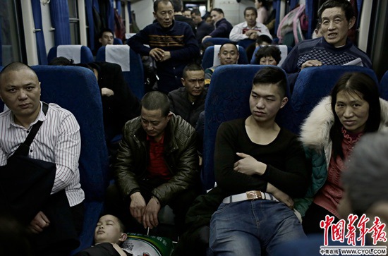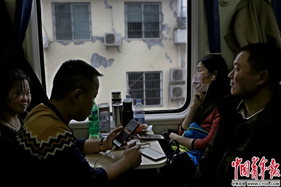 车上人密,气味杂,靠窗的徐艳平就一直戴着粉红色的口罩,口罩外露着白色的耳机线和银五星的耳钉,一双大眼睛骨碌碌地随着窗外的风景转动。她在浙江金华的印染厂做质检员,身旁30岁出头的丈夫何林是同一家厂的技术员。他们在四川南充下车,然后转车去阆中,8岁的孩子还在家等着他们。