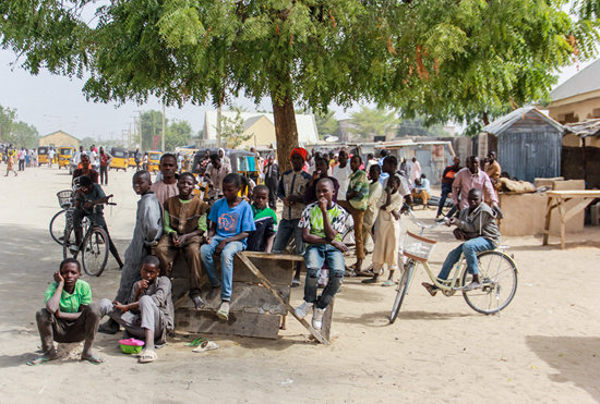 2月16日,在尼日利亚东北部博尔诺州首府迈杜古里,人们聚集在袭击现场附近的街道旁。尼日利亚警方16日说,尼东北部博尔诺州首府迈杜古里当天遭遇疑似“博科圣地”武装人员的袭击,造成包括袭击者在内的11人死亡。新华社/法新