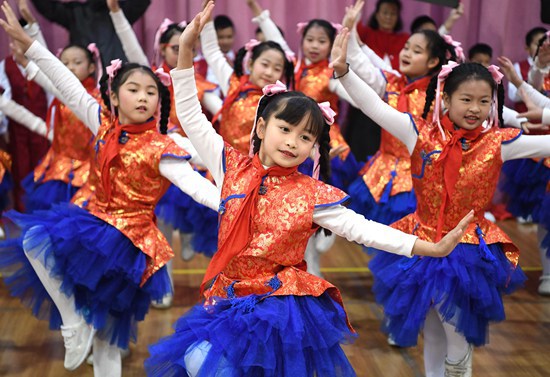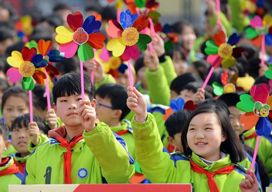 2月25日,安徽省亳州市风华桐乡路小学的学生们在新学期主题活动上舞动风车。张延林/摄(新华社发)