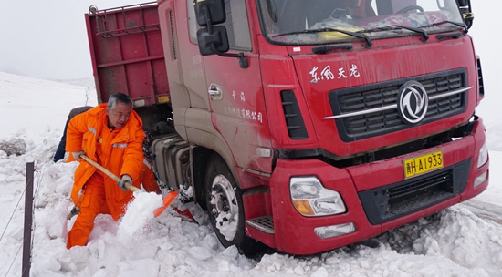 2月25日,青海省杂多公路段段长穆河翼在救援侧滑到路边的半挂卡车。新华社记者 李亚光/摄