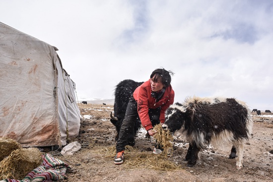 2月22日,才巴拉加在麦雄滩的帐篷前给牛犊喂饲料。今年年初,青海省玉树藏族自治州遭遇重度雪灾,部分地区积雪深度超过半米,牲畜觅食困难,饿死冻死超2万头只。目前,当地灾情仍在持续。除了购买饲草料,雪灾区的牧民将牲畜赶往周边未被积雪完全覆盖的草场,进行自救。新华社记者 吴刚/摄