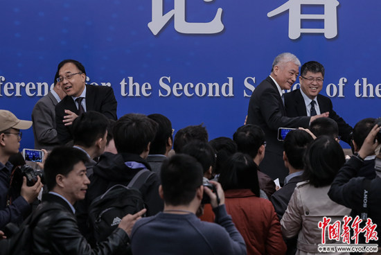 3月11日,十三届全国人大二次会议新闻中心记者会结束后,科技部部长王志刚(右二)回应中外记者的追问。中国青年报·中青在线 中国青年网记者 李峥苨/摄