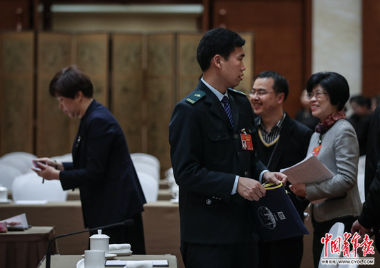3月14日,十三届全国人大二次会议上海代表团举行全体会议。会议结束后,全国人大代表柴闪闪(左二)收拾会议材料准备离开。柴闪闪出生于1985年,目前是上海邮区中心局的一名邮件接发员,被媒体称为“快递小哥”代表。