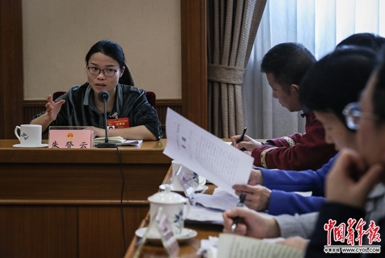 3月13日,十三届全国人大二次会议湖南代表团举行代表小组会议,审议最高人民法院工作报告和最高人民检察院工作报告,全国人大代表朱登云发言。这位85后的苗族女青年,来自湖南省怀化市靖州苗族侗族自治县渠阳镇大笋坪村,是当地一名返乡创业的大学生。中国青年报·中青在线 中国青年网记者 李峥苨/摄