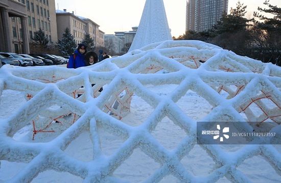 2018年12月22日,在哈尔滨工业大学校区内,冰雕、雪构、膜结构冰雪景观遍布校园,使哈工大成为名副其实的冰雪校园。图片均由视觉中国供图