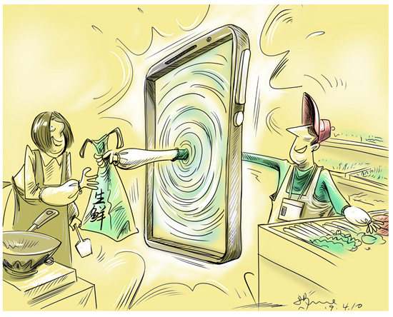 最近一年多,随着互联网巨头纷纷发力鲜菜业务,手机上的菜篮子也俨然从生鲜领域最难啃的鸡肋,变成了资本风口下的香饽饽。随着智能手机和移动支付方式普及,中老年群体也逐渐突破硬件和能力的“壁垒”。最近1年来,使用某外卖平台买菜的中老年用户数增长500%以上。(《北京日报》4月10日)漫画:徐简