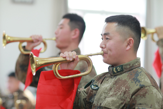 “再来一遍。”韩军杰笑得有些不好意思,但丝毫没有停手的样子。他享受吹响军号的那一刻,尽管只要短短十几秒,两腮就会酸痛。好在经过一段时间,吹出音已经不是问题,从练习发声到练习音准,他期待着下一个飞跃。
