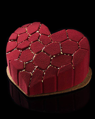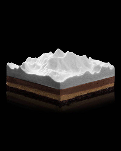 法式甜品多数造型较为简单。但覃菘设计的蛋糕,在外形上特别天马行空,举个例子,他的阿尔卑斯山山间的走向细,落差又大,要用软滑的奶油达到坚固的效果,需要反反复复多次才能完成。