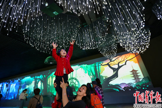 4月29日上午,北京市延庆区,2019中国北京世界园艺博览会国际馆内,一位观众把孩子高高举起触摸“星空”。当日,2019北京世园会正式对公众开放。