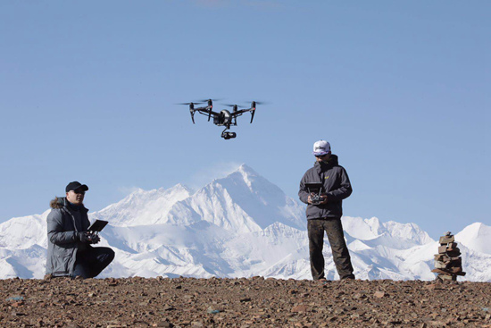 无人机驾驶员郑国强和张晶在珠穆朗玛峰拍摄纪录片时的工作场景。