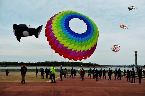 “五一”将至,山东日照各类特色活动吸引游客前来游玩,旅游热度逐渐升温。图为游客在观看风筝表演。视觉中国供图
