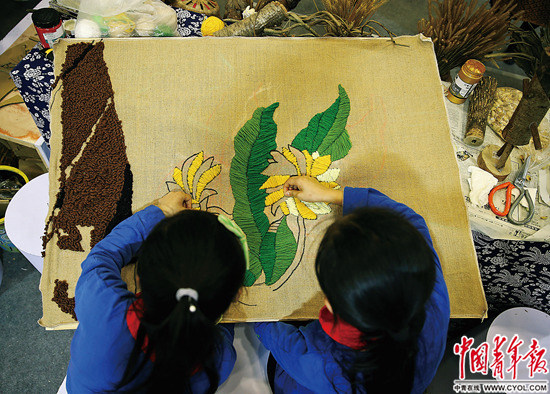 4月15日,重庆市开州区大德镇大慈中心小学“乡拾乡韵”工作坊,同学们在绣麻袋壁挂。