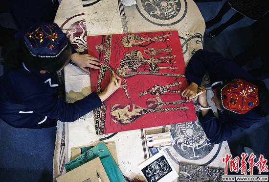 4月15日,新疆生产建设兵团第二师华山中学的两名女生在进行木刻版画的制作。