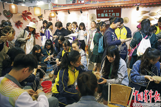 4月17日,江苏省苏州市国际博览中心,福建安溪华侨职业中专学校的学生正在引导参观者体验藤编制作。4月15日起,全国第六届中小学生艺术展演活动学生艺术实践工作坊在这里举行,来自全国31个省(区、市)和新疆生产建设兵团的学生展示了各具地域及民族特色的美育项目。