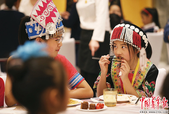 4月17日,上午的活动结束后,云南省曲靖市麒麟区西关小学的孩子们在工作坊旁的餐厅吃午饭。
