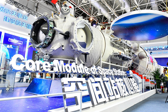 2018年11月6日,第十二届中国国际航空航天博览会(即珠海航展)在广东珠海开幕,中国空间站“天宫”核心舱(工艺验证舱)亮相航展。 视觉中国供图