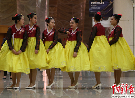 吉林省龙井高级中学的学生们排队等待参加小合唱《云雀》的演出。